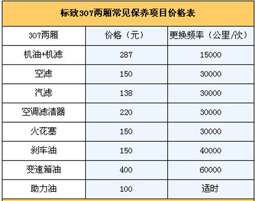 5.保養(yǎng)費: 我們向標致4S店售后服務人員咨詢過,他們說307一大優(yōu)勢是保養(yǎng)周期比較長,1.5萬公里才需要保養(yǎng)一次,是同級車型中保養(yǎng)花費最低的。通常新車首保在7500公里時進行,以后每1.5公里保養(yǎng)一次。第二次1.5萬公里時的常規(guī)保養(yǎng)(更換機油機濾)需花費287元;3萬公里保養(yǎng)(更換機油機濾+空濾+空調濾芯+汽濾+火花塞)為795元;4.5萬公里保養(yǎng)(更換機油機濾)花費287元;6萬公里保養(yǎng)(更換機油機濾+空濾+空調濾芯+汽濾+火花塞)為795元。