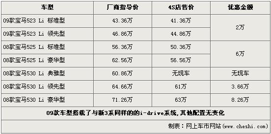 據(jù)4S店銷售人員介紹,寶馬5系各款車型優(yōu)惠金額均不同,最高優(yōu)惠達(dá)到了8.26萬。目前在售的523 Li車型全部為09款,其與新3系搭載了同樣的i-drive系統(tǒng),經(jīng)2萬元優(yōu)惠后,09款523 Li標(biāo)準(zhǔn)型與領(lǐng)先型售價(jià)分為降價(jià)為41.36萬元和44.86萬元。525 Li標(biāo)準(zhǔn)型和豪華型經(jīng)6萬元優(yōu)惠后售價(jià)降為50.36萬元和56.56萬元。530 Li豪華型的優(yōu)惠金額達(dá)到了全系最高的8.26萬元,售價(jià)也降到了71.26萬元。