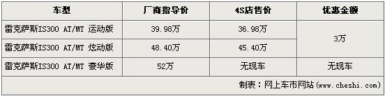 據(jù)4S店銷售人員介紹,因?yàn)閺S家對IS300系列減產(chǎn),所以目前的現(xiàn)車并不是很多。目前炫動版和豪華版店內(nèi)都有現(xiàn)車,此兩款車在經(jīng)3萬元優(yōu)惠后,售價(jià)分別為36.98萬元和45.40萬元。而多了真皮座椅等配置的雷克薩斯IS300 豪華版店內(nèi)沒有現(xiàn)車銷售,所以不在此次優(yōu)惠列隊(duì)中。