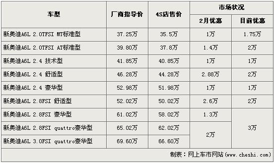 記者從奧迪地區(qū)經(jīng)銷商處了解,奧迪新A6L全系有不同程度優(yōu)惠調(diào)整,最高達(dá)到了3萬元。入門級的2.0TFSI手動標(biāo)準(zhǔn)型優(yōu)惠金額上漲到了1.75萬元,2.0TFSI自動標(biāo)準(zhǔn)型優(yōu)惠金額也上漲到了2萬元。2.4L排量除了舒適型優(yōu)惠金額減小到了2萬元外,同排量其他車型優(yōu)惠金額均沒變。全系高配的2.8FSI四驅(qū)型和3.0FSI四驅(qū)型的售價(jià)也從2萬元升到了3萬元,達(dá)到了全系最高。