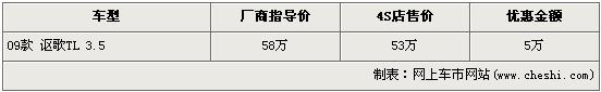 據(jù)4S店銷售人員介紹,在售的只有09款謳歌TL 3.5一種車型,廠商指導(dǎo)價(jià)為58萬元,F(xiàn)在購買09款謳歌TL3.5的消費(fèi)者可以享受到5萬元的現(xiàn)金優(yōu)惠,經(jīng)優(yōu)惠后售價(jià)從58萬元下降到了53萬元。4S店內(nèi)現(xiàn)車比較齊全,消費(fèi)者有一定的挑選空間。