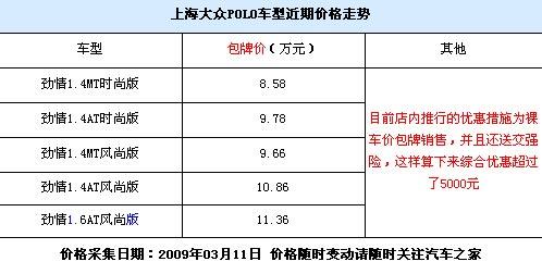 近期小型車市場可以說是大事不斷,峰范、嘉年華的先后上市都對這一市場的格局造成了一定的影響,而作為這一系列的主力車型之一的POLO車型也不甘示弱。近期,筆者通過深圳地區(qū)的上海大眾經(jīng)銷商處了解到,目前POLO 勁情車型在深圳地區(qū)的優(yōu)惠措施為裸車價(jià)包牌銷售,即相當(dāng)于免除了購置稅、上牌費(fèi)等一系列費(fèi)用,并且還送交強(qiáng)險(xiǎn)。具體詳情請見下表: