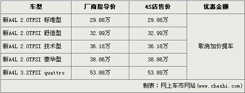 奧迪新A4L自從廣州車展發(fā)布以來受到眾多消費(fèi)者關(guān)注,全新的淚眼設(shè)計(jì)外觀再加上多項(xiàng)高科技安全配置使這款車在同級(jí)別車中更凸顯出奧迪一貫的品質(zhì)。記者最近從北京地區(qū)奧迪經(jīng)銷商處了解,目前新A4L新車取消了加價(jià)提車,具體車型價(jià)格如下: