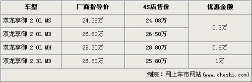 憑越野車起家的雙龍,向來是以生產(chǎn)SUV而著稱的,旗下的雙龍享御更是其的代表之作,其2.0L車型搭載的柴油發(fā)動(dòng)機(jī)更是源于奔馳的技術(shù)。雙龍享御共有四款車型,售價(jià)區(qū)間為24.38萬元-29.30萬元。近日根據(jù)網(wǎng)上車市價(jià)格監(jiān)測顯示,雙龍享御全系最高優(yōu)惠1萬元,詳情請看下表: