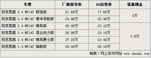 別克君越一直是中高級(jí)車市最受關(guān)注的車型之一,這款車搭載了全球普及率較高的ECOD-VVT2.4L全鋁智能發(fā)動(dòng)機(jī),并配以6速手自一體變速箱,在動(dòng)力上比老款有非常大的提升。根據(jù)網(wǎng)上車市價(jià)格監(jiān)測(cè)系統(tǒng)顯示,目前君越優(yōu)惠已過(guò)4萬(wàn)元,具體車型和價(jià)格如下: