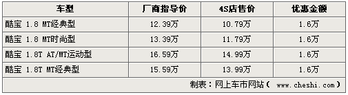 酷寶系列車型,不僅外形時尚,動力也相當(dāng)充沛,不僅可與進(jìn)口跑車如蓮花競速相媲美,也帶動了自主跑車市場的競爭。近期網(wǎng)上車市網(wǎng)站了解到,隨著市場競爭的加劇,現(xiàn)在各家4S店均可給出全系16000元的現(xiàn)金優(yōu)惠,令此車型再次引起關(guān)注。具體詳情如下:
