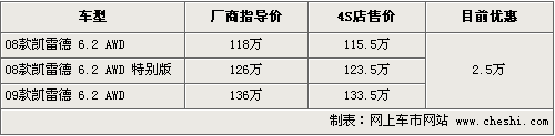 凱雷德是凱迪拉克家族一款大尺寸的SUV產(chǎn)品,結(jié)合6.2的大排量,從內(nèi)而外都給人粗曠和厚實(shí)的感覺。其搭載的全新的6前速手自一體自動(dòng)變速箱非常適用于低轉(zhuǎn)速高速巡航,也極大提高了瞬間的加速性能。根據(jù)網(wǎng)上車市價(jià)格監(jiān)測(cè)系統(tǒng)顯示,目前凱雷德優(yōu)惠2.5萬元,具體車型以及價(jià)格如下: