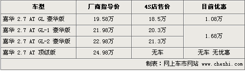 筆者從起亞嘉華北京地區(qū)經(jīng)銷(xiāo)商處了解到,目前2.7排量入門(mén)級(jí)優(yōu)惠1.08萬(wàn)元,優(yōu)惠后售價(jià)為18.5萬(wàn)元,4S店有銀色、黑色現(xiàn)車(chē)可供選擇。豪華版GL-1和GL-2兩款優(yōu)惠1.68萬(wàn)元,有銀灰色現(xiàn)車(chē)可供選擇。頂級(jí)版目前沒(méi)有現(xiàn)車(chē)供應(yīng)。