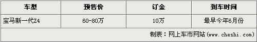 據(jù)北京寶馬經(jīng)銷店銷售人員介紹,將引進(jìn)國(guó)內(nèi)的全新一代寶馬Z4分為sDrive30i和sDrive35i兩種車型,售價(jià)預(yù)計(jì)為60-80萬(wàn)元。目前店內(nèi)可以接受新Z4的預(yù)訂,訂金為10萬(wàn)元。寶馬Z4 sDrive35i車型搭載了與寶馬X6 35i相同的3.0升雙渦輪直6引擎,最大功率達(dá)到了225Kw,最大扭矩達(dá)到了400Nm。現(xiàn)車方面銷售人員透露,最早的一批現(xiàn)車最快將會(huì)在6月份抵達(dá)北京寶馬經(jīng)銷店,車型應(yīng)該為sDrive30i,交訂金的消費(fèi)者將會(huì)第一時(shí)間提到現(xiàn)車。