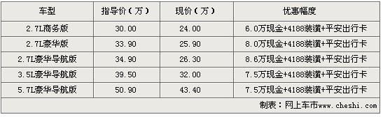 克萊斯勒300c 更讓人稱道的是其美國國家五星級安全標準配置。 大燈噴淋、倒車雷達、緊急制動助力、電動防夾車窗等配置使300c 于2006年榮登《福布斯》美國市場十大最安全車型。 近日根據(jù)網(wǎng)上車市價格監(jiān)測系統(tǒng)顯示,上海地區(qū)購買克萊斯勒300C全系最高可以得到8.6萬元的現(xiàn)金優(yōu)惠。具體車型價格如下: