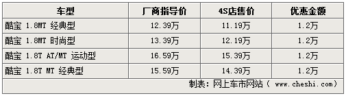 酷寶系列車型,不僅外形時尚,動力也相當(dāng)充沛,不僅可與進(jìn)口跑車如蓮花競速相媲美,也帶動了自主跑車市場的競爭。近期網(wǎng)上車市網(wǎng)站了解到,隨著市場競爭的加劇,現(xiàn)在各家4S店均可給出全系12000元的現(xiàn)金優(yōu)惠,令此車型再次引起關(guān)注。具體詳情如下:
