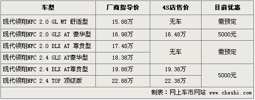 北京現(xiàn)代領翔在去年12月份正式上市,這款車定位于高端市場,推出了2.0和2.4兩個排量共六款車型。自上市以來,領翔在價格上一直沒有出現(xiàn)優(yōu)惠,根據網上車市價格監(jiān)測系統(tǒng)顯示,目前購買這款車可現(xiàn)金優(yōu)惠5000元,具體車型以及價格如下: