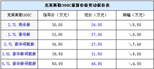 目前克萊斯勒300C現(xiàn)車狀況一般,不同經(jīng)銷商處現(xiàn)車數(shù)量及車型顏色不同,從我們了解的情況來(lái)看現(xiàn)300C全系最高優(yōu)惠8萬(wàn)元左右,2.7L低配車型的價(jià)格僅為24.5萬(wàn)元,優(yōu)惠最大的3.5L豪華領(lǐng)航版售價(jià)31.5萬(wàn)元,性價(jià)比不錯(cuò),感興趣的朋友可以與經(jīng)銷商聯(lián)系,來(lái)店詳談價(jià)格還能再低一些。