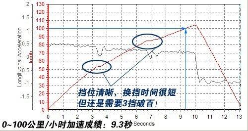 成績雖然出來了,但測試過程我們還是要關(guān)注一下。由于是6擋密齒比設(shè)定,酷寶需要換上3擋速度才能破百,剛才我們已經(jīng)說了,換擋行程和擋把過長都會影響成績,從圖中可以看出,我們的擔(dān)心確實(shí)映現(xiàn)了。換擋影響了時(shí)間,但總體來看9.3s的成績比較令人滿意。
