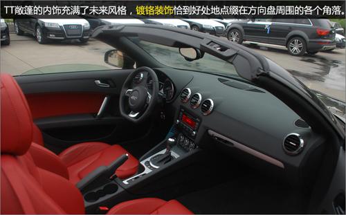TT的內(nèi)飾采用了大量的鋁合金飾板,整個(gè)車室彌漫著金屬美感?照{(diào)出風(fēng)口、儀表盤和其他按鍵均以圓形為基調(diào),藉以和圓滑的外形相呼應(yīng)。這些一絲不茍的設(shè)計(jì)充分顯示出其出類拔萃的名門風(fēng)范。