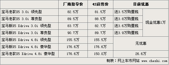 筆者從寶馬北京地區(qū)經(jīng)銷商處了解到,近日寶馬重磅推出了“四重購車禮的”新春購車促銷活動,其中有一項是送車輛購置稅,針對車型包括X5在內(nèi)。據(jù)介紹,從2月1日到3月31日期間購買X5的客戶可以贈送50%的車輛購置稅,其中包括了新老款共四款車型,但只針對3.0排量。新X5尊貴型3.0排量最高送近4萬元的購置稅,購車同時3.0排量還將有1萬元左右的現(xiàn)金優(yōu)惠。而目前老款X5豪華型1.8排量還有少量現(xiàn)車,當(dāng)前最高優(yōu)惠可達(dá)到26.6萬元。4S店內(nèi)有黑色和銀色的現(xiàn)車供應(yīng),消費(fèi)者可到店咨詢具體行情。