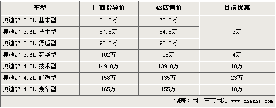 據(jù)奧迪4S店銷售人員介紹,目前銷售的奧迪Q7包括了3.6和4.2排量共7款車型。消費者在購買的同時可以選擇個性化選裝配置,其中包括了座椅顏色,內飾顏色,剎車盤,音響等一系列配置,據(jù)介紹,選擇個性化配置后,車價將有相應增加。同時消費者可以直接購買原車型,目前全車系3.6排量三款車優(yōu)惠3萬元現(xiàn)金,豪華版優(yōu)惠4萬。而4.2舒適型最低可優(yōu)惠到135萬,降幅達23萬。目前4S店現(xiàn)車主要以黑色為主,內飾有灰色、米色可供選擇。