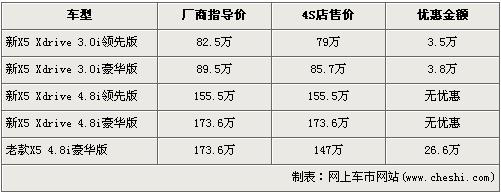 據(jù)經(jīng)銷商處銷售人員介紹,近期購買X5的消費(fèi)者可以得到最高26.6萬元的優(yōu)惠。新款的寶馬X5 3.0L車型目前有買車送一半購置稅的活動(dòng),購置稅優(yōu)惠的價(jià)值可以直接抵車價(jià),經(jīng)抵價(jià)轉(zhuǎn)換后,新X5 3.0i領(lǐng)先版和豪華版經(jīng)3.5及3.8萬元優(yōu)惠后售價(jià)降為了79萬元和85.7萬元,新寶馬X5 4.8i車型目前仍然沒有優(yōu)惠。銷售人員就介紹,老款的X5 4.8i豪華版有26.6萬元的高額優(yōu)惠,售價(jià)從173.6萬元降到了147萬元。
