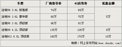據(jù)經(jīng)銷(xiāo)商銷(xiāo)售人員介紹,目前店內(nèi)途銳全系均有不同優(yōu)惠,最高讓利達(dá)到了10萬(wàn)元。搭載V6發(fā)動(dòng)機(jī)的3.6L車(chē)型優(yōu)惠現(xiàn)金5萬(wàn)元,3.6L車(chē)型經(jīng)優(yōu)惠后售價(jià)分別為:標(biāo)準(zhǔn)型69萬(wàn)元,豪華型75萬(wàn)元,頂級(jí)型81萬(wàn)元;搭載V8發(fā)動(dòng)機(jī)的3.6L頂級(jí)型經(jīng)9萬(wàn)元優(yōu)惠后售價(jià)降到了126萬(wàn)元;搭載W12發(fā)動(dòng)機(jī)的全系頂配車(chē)型6.0L頂級(jí)版經(jīng)10萬(wàn)元的優(yōu)惠后售價(jià)從180萬(wàn)降到了170萬(wàn)元。