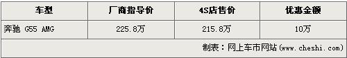 根據(jù)北京奔馳4S店銷(xiāo)售人員介紹,目前奔馳G55 AMG現(xiàn)金優(yōu)惠10萬(wàn)元。經(jīng)優(yōu)惠后,奔馳G55 AMG售價(jià)從廠商指導(dǎo)價(jià)的225.8萬(wàn)元下降到了215.8萬(wàn)元。銷(xiāo)售人員還介紹,奔馳G55 AMG只有一部黑色現(xiàn)車(chē)在售,而且北京多家奔馳經(jīng)銷(xiāo)店均無(wú)現(xiàn)車(chē),消費(fèi)者挑選的空間不大。顏色方面引進(jìn)國(guó)內(nèi)的G55 AMG只有黑色,其他顏色均不銷(xiāo)售。