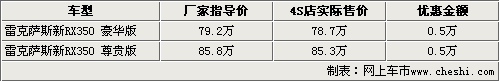 據(jù)北京雷克薩斯4S店銷售人員介紹,目前各4S店均有新RX350的現(xiàn)車銷售,而且貨源相對比較充足,F(xiàn)在購車在可以得到5000元的現(xiàn)金優(yōu)惠還,還可以得到商家贈送的簡單裝飾。銷售人員還表示,新款RX350由于原裝進(jìn)口車型,所以車型的手續(xù)還有到店。消費(fèi)者在購車后還需要等待10個工作日左右才可以上牌。