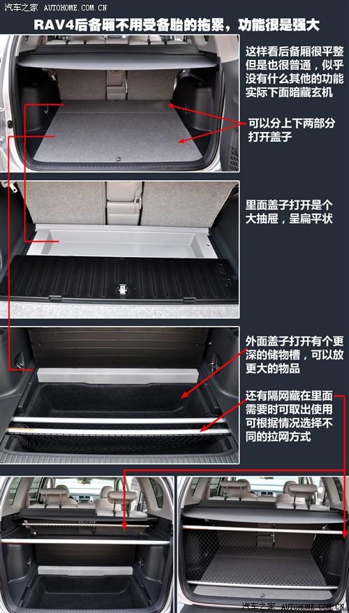 最強大的是RAV4的后備廂,首先側(cè)開的尾門本身就比較方便,只是針對關面我們提到過的車門鉸鏈強度問題后續(xù)還要進行關注。后備廂非常平坦,得益于備胎外掛的形式,儲物能力也非常強。地板可以分兩部分打開,靠里面的打開是類似一個抽屜的儲物格,靠外面的則是比較深的一個大儲物槽,同時還有隔離網(wǎng)袋可以取出來用,分兩種方式掛在廂壁上的掛鉤上,將后備廂分隔開來,方便固定物品。