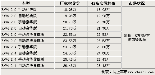 2009年4月10日,一汽豐田正式推出了首款SUV車型RAV4,售價(jià)18.98-26.43萬元。作為一款日系經(jīng)典城市SUV車型,起初以進(jìn)口方式銷售時(shí)就得到了廣大消費(fèi)者的喜愛,此次國(guó)產(chǎn)后由于價(jià)格較進(jìn)口車型有所降低,進(jìn)一步提升了RAV4的性價(jià)比。那么剛剛上市RAV4的市場(chǎng)狀況究竟如何呢?記者在走訪北京地區(qū)一汽豐田4S店時(shí)了解到:目前國(guó)產(chǎn)RAV4現(xiàn)車現(xiàn)已到店,但是由于貨源比較緊張,消費(fèi)者需要加價(jià)1.5萬元或2萬元裝飾才可以提到現(xiàn)車。具體車型售價(jià)見下表: