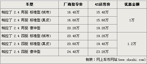 據(jù)4s店銷售人員介紹,帕拉丁兩驅(qū)車型的優(yōu)惠金額為1萬元,四驅(qū)車型的優(yōu)惠金額為1.2萬元。帕拉丁為2.4L,車系分為前置后驅(qū)和前置四驅(qū)兩種驅(qū)動形式,每種驅(qū)動形式中又分為標(biāo)準(zhǔn)版及豪華版,標(biāo)準(zhǔn)版分為絨布座椅或真皮座椅。絨布座椅全系最低配的帕拉丁 2.4兩驅(qū)標(biāo)準(zhǔn)版經(jīng)優(yōu)惠后售價(jià)降為15.48萬元,而操縱性能更加穩(wěn)健,全系最高配的帕拉丁 2.4四驅(qū)豪華版經(jīng)優(yōu)惠后售價(jià)也降到了23.28萬元。目前帕拉丁兩驅(qū)與四驅(qū)的豪華車型均無現(xiàn)車,欲購買的消費(fèi)者需交訂金1萬元,兩周后可提車。
