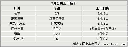 轟轟烈烈的2008上海車展將于今天正式閉幕,而車展上首發(fā)的新車、概念車讓人印象深刻,不過在亮相之后,他們最終都會量產(chǎn)上市。在即將到來的五月份就將有6款新車型上市,其中自主品牌繼車展后再唱主角,有3款新車型上市,分別為長豐CS7、奇瑞QQme及奔騰B50。