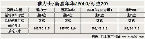 四款車型的前后剎車形式都是通風(fēng)盤+蹄鼓式剎車,輪胎尺寸方面新建年華運(yùn)動(dòng)版和POLO Sporty兩款用到了更大的16寸輪胎并且寬度也更寬,非常符合這兩款車型突出運(yùn)動(dòng)性的定位。而雅力士和標(biāo)致207的15寸車輪配合185輪胎寬度在同級(jí)別車型中也是中規(guī)中矩的配置。