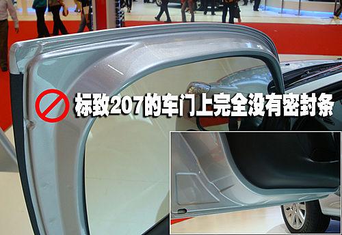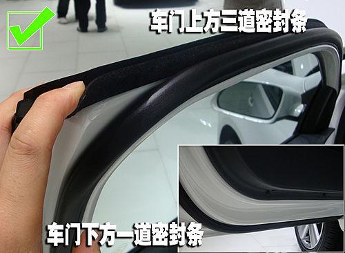 標(biāo)致207在車(chē)門(mén)一側(cè)完全沒(méi)有設(shè)計(jì)密封條,在其車(chē)門(mén)上也沒(méi)有任何可以固定密封條的固定點(diǎn)。不過(guò)在車(chē)身一側(cè)門(mén)框的位置設(shè)計(jì)了兩道密封,不過(guò)盡管是這樣標(biāo)致207依然是這項(xiàng)對(duì)比中最差的一個(gè)。