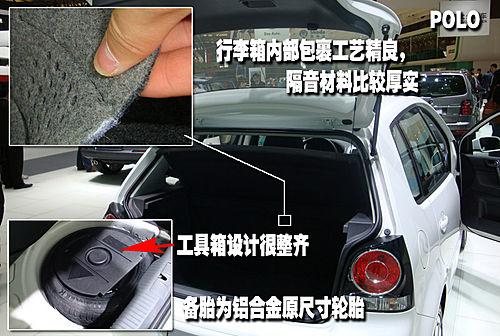 上海大眾polo是唯一標(biāo)配鋁合金輪轂全尺寸備胎的車(chē)型,行李箱內(nèi)部的包裹材料相比新建年華而言更加厚實(shí)和柔軟。位于備胎內(nèi)部分工具箱設(shè)計(jì)的很有特色,完全沒(méi)有凌亂的感覺(jué)非常的整齊。