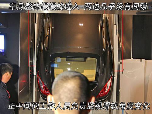 再快將車身完全吊起之前,一直都由一名工作人員監(jiān)視著滑軌和運(yùn)輸架的動(dòng)作,并監(jiān)控著車身與電梯兩側(cè)的距離?粗嚿砺耐耆M(jìn)入電梯內(nèi),想必工作人員的心都在逐漸放松吧。