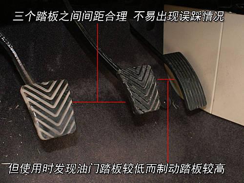 油門(mén)以及各個(gè)踏板設(shè)計(jì)的間距較大,不用擔(dān)心誤踏情況的發(fā)生。實(shí)際使用過(guò)程中發(fā)現(xiàn)各個(gè)踏板的高度并不統(tǒng)一,這點(diǎn)需要慢慢的適應(yīng)。