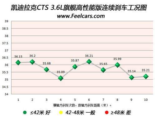 再來(lái)看看新CTS的連續(xù)10次剎車成績(jī),最差成績(jī)?yōu)?6.21米,與最好成績(jī)差距僅為1.1米,且大部分成績(jī)均在36米以內(nèi),說(shuō)明新CTS的剎車系統(tǒng)散熱效果非常好,始終保持在最佳的工作狀態(tài),沒有出現(xiàn)熱衰減現(xiàn)象。