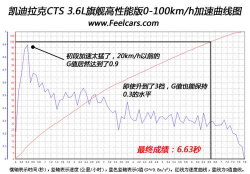 通過下面的曲線圖可以看出,新CTS的初段加速非常猛,20km/h以前的G值達到了0.9G,而即使變速器升到了3檔,G值也能保持0.3G的水平。
