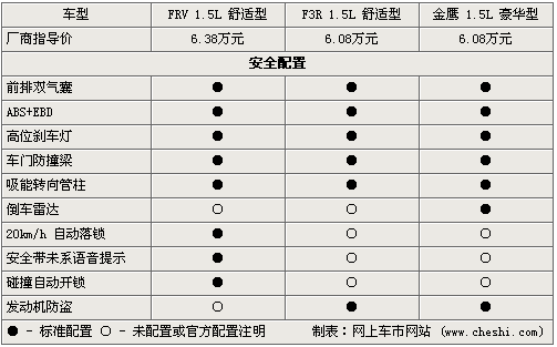 在安全配置方面,三款車型都標(biāo)配前排雙氣囊、ABS+EBD、高位剎車燈、車門防撞梁這樣的基本配置,同時(shí)FRV還帶有20km/h自動(dòng)落鎖、安全帶未系語(yǔ)音提示、碰撞自動(dòng)開(kāi)鎖這三個(gè)實(shí)用配置,但沒(méi)有配置發(fā)動(dòng)機(jī)電子防盜。吉利金鷹是唯一配置倒車?yán)走_(dá)的車型,能為駕駛員泊車提供幫助。