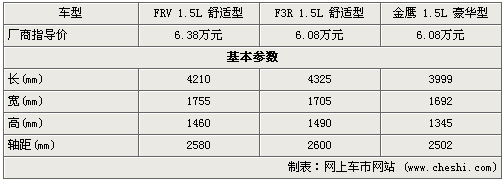 從基本參數(shù)來(lái)看,比亞迪F3R在車長(zhǎng)及軸距在三款車中比較突出,相應(yīng)的內(nèi)部空間也將比較寬大些,而駿捷FRV稍次之但車身較高,頭部空間方面會(huì)比較好一些,而金鷹明顯要比他們小一號(hào)。