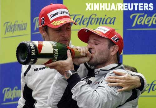 5月10日,布朗GP車(chē)隊(duì)的英國(guó)車(chē)手巴頓(左)和隊(duì)友巴里切羅慶祝勝利。當(dāng)日,在F1西班牙大獎(jiǎng)賽中,巴頓奪得冠軍,巴里切羅獲得亞軍。新華社/路透