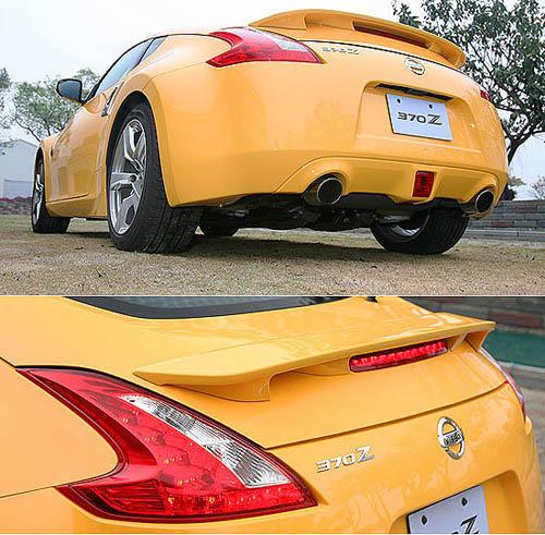 為了強化運動氣息,標(biāo)準(zhǔn)版的370Z標(biāo)配后擾流尾翼;雖然造型不顯夸張,仍頗具畫龍點睛之效;而后保桿的造型也小有來頭:左右大口徑雙出尾管已是性能車不可或缺的身份表彰,設(shè)計師更在中央位置加入一組方型后霧燈。除了后霧燈的作用外,此一燈具在踩踏剎車時也會同步有反應(yīng),頗有模仿F1賽車雨天警示燈組的意味。