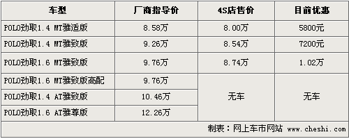 據(jù)銷售人員介紹,目前POLO勁情全系優(yōu)惠幅度從3900元-6000元不等,優(yōu)惠后售價從8.19萬-10.56萬元。同時,近期推出的POLO運(yùn)動款也受到消費(fèi)者喜愛,據(jù)銷售介紹,現(xiàn)車到店即買。運(yùn)動款主要有藍(lán)色、黑色以及白色。目前POLO勁情以及運(yùn)動版均已沒有現(xiàn)車供應(yīng),需預(yù)定,訂金為1萬,一個月時間才能提車。