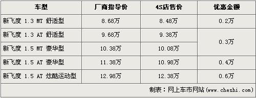 據(jù)廣州本田北京地區(qū)4S店銷售人員介紹,新飛度 1.5L炫酷運(yùn)動版的優(yōu)惠金額為6000元。新飛度在售車型分為1.3L及1.5L共5個車型在售,1.3L手動舒適版的優(yōu)惠金額為2000元,現(xiàn)售價為8.48萬元。1.3L自動舒適版的優(yōu)惠金額為3000元,現(xiàn)售價為9.38萬元。1.5L豪華版的手動和自動車型經(jīng)4000元優(yōu)惠后,現(xiàn)售價分別為10.08萬元和10.98萬元,1.5L炫酷運(yùn)動版的優(yōu)惠6000元,現(xiàn)售價為12.38萬元。