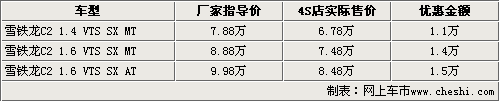 目前北京地區(qū)4S店主要賣的是C2運(yùn)動版VTS車型,購車的消費(fèi)者不僅可以享受到最高1.5萬元的現(xiàn)金優(yōu)惠,而且還能得到商家隨車贈送的部分車內(nèi)裝飾。目前C2運(yùn)動版VTS主要有紅色、黑色等款,顏色和車型并不是很全,個別款需要預(yù)訂,其余車型均沒有現(xiàn)車銷售。