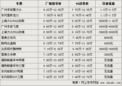 隨著石油價格逐步上漲,小排量車逐漸受到消費(fèi)者親睞。為了爭得市場,各汽車品牌推出的1.6L以內(nèi)AO級車型數(shù)量和款式越來越多,競爭也隨之加劇。以下我們總結(jié)的13款A(yù)O級車型價格均在7萬-13萬之間,排量覆蓋了1.2、1.3、1.4、1.5和1.6五個區(qū)間,可供選擇的空間非常大,而價格優(yōu)惠從2000元-2.5萬元不等,在消費(fèi)者購車時既可以享受小排量購置稅的優(yōu)惠政策,也可以得到4S店的降價優(yōu)惠,既省車錢,又能少花油錢。具體車型以及價格優(yōu)惠參考如下: