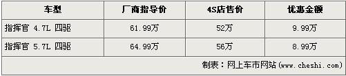 據(jù)經(jīng)銷商處銷售人員介紹,由于現(xiàn)在在售的指揮官車型均為大排量消費稅推出后入關(guān)的車型,所以廠商指導(dǎo)價都是調(diào)整后的價格,售價分別為61.99萬元和64.99萬元。近期購買指揮官的消費者可以享受到最高9.99萬元的優(yōu)惠,4.7L排量車型經(jīng)9.99萬優(yōu)惠后,售價降到了52萬元,5.7L車型經(jīng)8.99萬元優(yōu)惠后售價也降到了56萬元。
