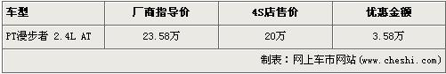 據(jù)北京克萊斯勒經(jīng)銷店銷售人員介紹,近期購買PT漫步者的消費者可以得到3.58萬元的優(yōu)惠。在售的PT漫步者為2.4L自動檔車型,售價為23.58萬元。經(jīng)優(yōu)惠后,PT漫步者的售價從23.58萬元下降到了20萬元。銷售人員還說,店內(nèi)現(xiàn)車顏色主要是黑色和銀色,欲購買其他顏色的消費者需交定金1萬元,最快下周就可提車。