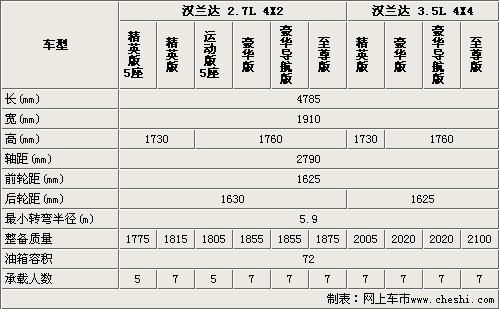 國(guó)產(chǎn)漢蘭達(dá)的車身尺寸與進(jìn)口車型相同,由于國(guó)產(chǎn)漢蘭達(dá)精英型沒有配備車頂行李架,所以要比運(yùn)動(dòng)版、豪華版和至尊版矮了30mm。將近2.8米的軸距為漢蘭達(dá)提供了舒適的內(nèi)部空間。國(guó)產(chǎn)漢蘭達(dá)較進(jìn)口車型有添加了5座車型,進(jìn)一步滿足了不同消費(fèi)者的需求(進(jìn)口車型均為7座車型)。國(guó)產(chǎn)漢蘭達(dá)的轉(zhuǎn)彎半徑僅為5.9米,保證了該車型的道路通過性。
