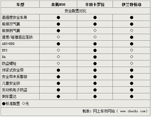 在安全裝備上,奔騰B50五款車型采用的是同樣的配置,前排雙氣囊、駕駛員自動(dòng)預(yù)緊安全帶、駕駛員安全帶未系報(bào)警等都為標(biāo)配,防炫目內(nèi)后視鏡、后門兒童鎖、間歇式寬幅雨刷都為保障駕駛安全設(shè)計(jì)。對比另外兩款車型則少了EPS以及BA等輔助安全系統(tǒng)。