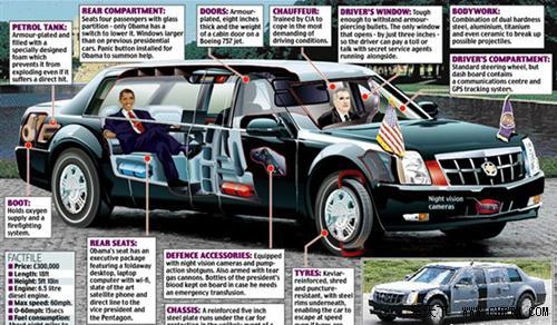除此之外,它還擁有散彈槍、紅外夜視攝像頭和催淚瓦斯投放裝置等,甚至還有奧巴馬的血液儲(chǔ)備,后排融合了一系列的新技術(shù),并配備了移動(dòng)辦公室,可以防止扎破和被炸成碎片的凱夫拉強(qiáng)化輪胎以及由特種鋼制成的輪圈,它可以在沒有輪胎的情況下支撐車輛行駛。