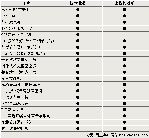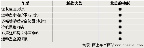 新款戈藍(lán)還增加了戈藍(lán)韻動版車型,這款新車在整車的設(shè)計方面都有新的變化。在外觀方面,戈藍(lán)韻動版采用深灰色HID大燈、運動型灰色涂裝水箱護罩以及多幅動感鋁合金輪轂。內(nèi)飾方面采用了黑色內(nèi)飾風(fēng)格,配備了12聲道環(huán)繞立體聲喇叭和運動型金屬踏板,使整車看上去更具運動氣質(zhì)。